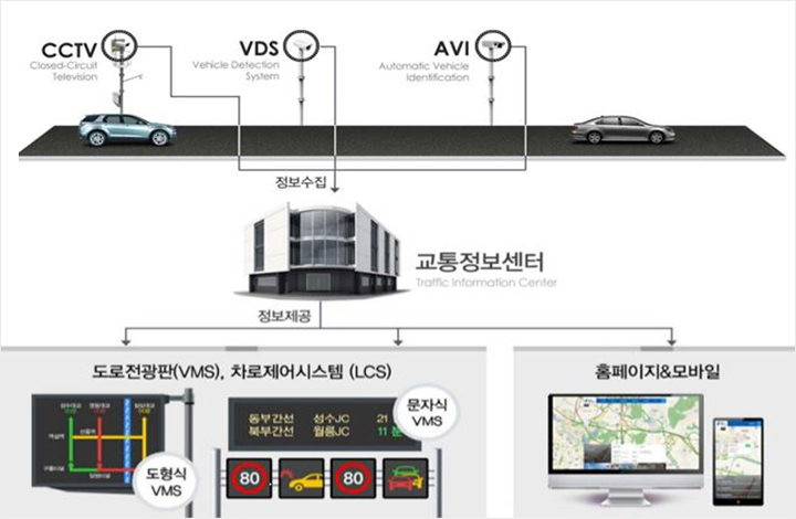 도로에 설치된 CCTV, AVI, VDS 등을 통하여 수집된 정보를 교통정보센터에서 가공하여